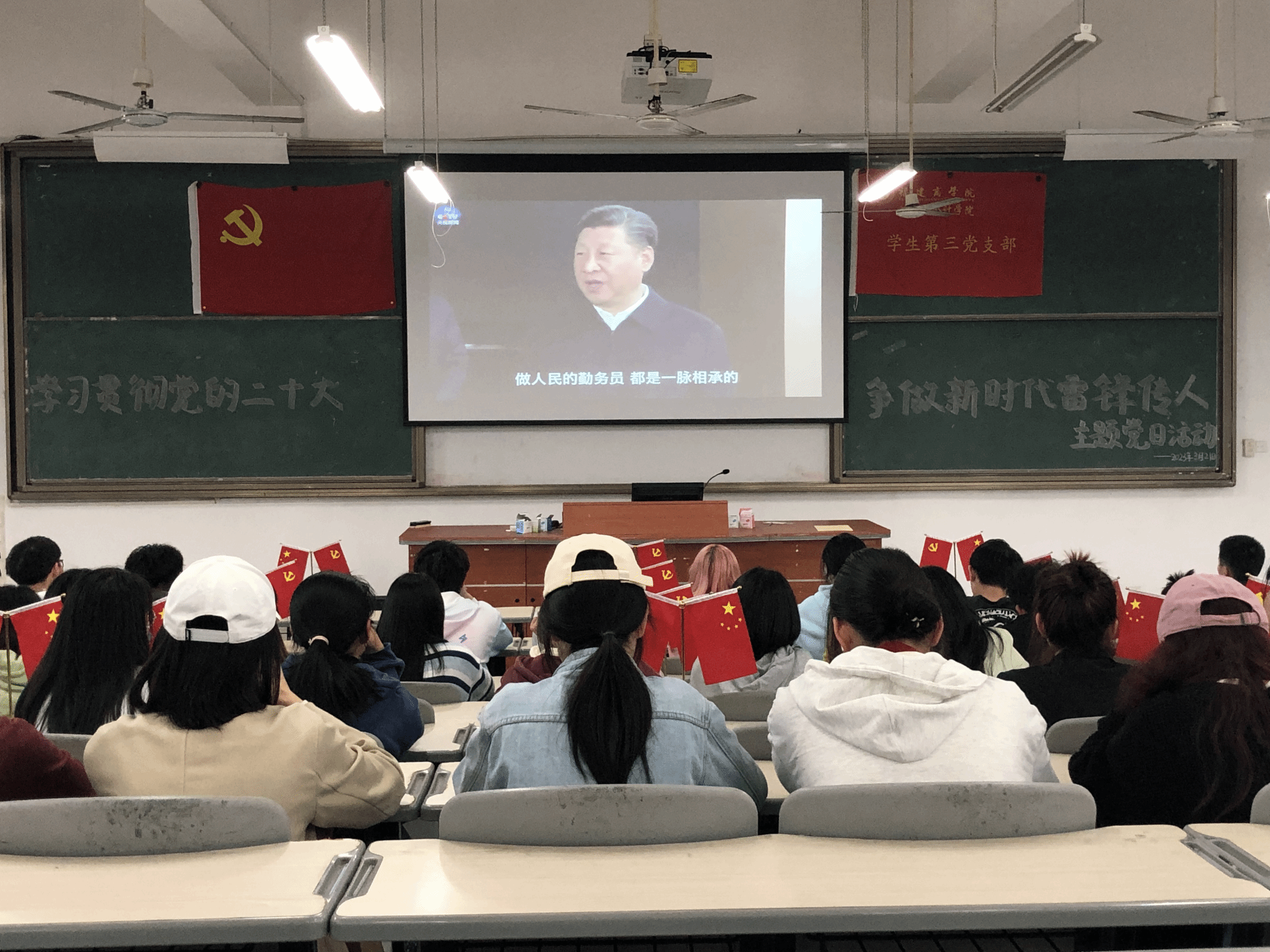 活动现场,支部全体成员认真聆听党的二十大精神宣讲报告,观看追“锋”记,分享观后感。学生党员叶寿炆说“坚持从我做起,从身边的小事做起,做雷锋精神的继承者、践行者、传播者,坚守初心使命、勇挑时代担当”。学生党员林倩分享到“学生党员应该努力钻研雷锋精神,坚持‘互相帮助、助人自助’的互助精神,让雷锋精神在新时代绽放更加璀璨的光芒。”随后,支部全体成员走出教室争当志愿者,清扫校园环境卫生,为美化校园环境贡献自己的一份力量。